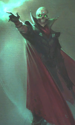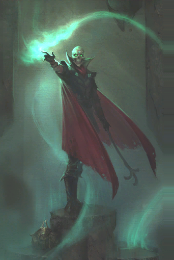 The rest of his body is a normal human-appearing skeleton. However, he usually hides the rest of his bony form with thick, layered, and luxurious clothes. He likes to be well dressed! By necessity, these outfits always include a hood, at least until he gets a way to don a disguise to avoid being harassed by primitives. Ugh.